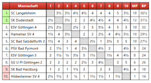 Als Aufsteiger war vor der Saison klar der Klassenerhalt das Ziel. Allerdings auf Grund unseres starken Saisonstartes, hätten wir schon den Durchmarsch realisieren können. Am 5. Spieltag kam es in Langesheim zum Top Duell! 1 gegen 2 leider hatte wir eine kurzfristige Absage zur vermelden, weswegen wir nur zu 5. antreten konnten. Dieser Punktverlust schmerzte und auch der Kampf lief leider wenig erfolgreich. Wir verloren 4,5:1,5 Diese Niederlage hat uns leider den Stecker gezogen, danach war die Luft raus und wir spielten die Saison nur noch seriös zu Ende. Aufstieg war weg und um in Abstiegsnöte zu geraten, hatten wir bereits zu gut gepunktet. Schade, dass wir im entscheidenden Kampf nicht in voller Stärke antraten. Aber es überwiegt das Positive! Wir hatten zu keinem Zeitpunkt der Saison Abstiegssorgen! Es war eine gelungene Saisonsleistung! Danke an alle, die mich als Mannschaftsführer unterstützt haben und sich für den Verein und für die Manschaft so leidenschaftlich präsentiert haben!