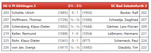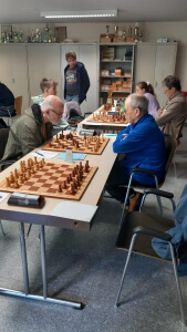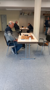 Nach etwa 2.5Std kam dann Paul zu mir, um mir mitzuteilen, dass das Handy seines Gegners bereits zum 2. Mal geklingelt hat. Dieses ist ein klarer Regelverstoß, woraufhin ich zur Mannschaftsführerin Svenja von Jan gegangen bin und den Gewinn für Paul beanspruchte. Dankesschön an Svenja für die souveräne und gute Entscheidung hier direkt auf Sieg für uns zu entscheiden. Das war professionell und neutral! Kompliment! Die Stellung war zwar ausgeglichen, aber mit leichten Vorteilen für Paul. Als dann auch Siegfried recht zügig remis spielte führten wir 2:1 – Mit diesem einen Brettpunkt war SG U Pl Göttingen 2 auch theoretisch der Klassenerhalt sicher. Gratulation zum Verbleib in der Bezirksklasse.