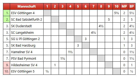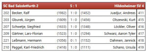 Hermann spielte ein Brett 5 eine sehr saubere und tolle Partie, zwischenzeitlich hätte er mit einem Turmopfer die Partie gewinnen können. Leider sah er die Kombination nicht, so dass die Partie weiter ausgeglichen blieb. In der Zwischenzeit konnte Karl einen Turm gewinnen und fuhr damit auch den zweiten Punkt für Salzdetfurth ein. Leider wollte Hermann die Damen nicht tauschen und seine eigene geriet so in Gefahr, dass er sie gegen einen Turm geben musste. Jetzt war die Partie gekippt und Jannick konnte den ersten Punkt für Hildesheim holen. Erfreulicherweise konnte Ralf mit einem Zwischenschach einen Springer gewinnen worauf sein Gegner Andreas die Partie auch aufgab – Zwischenstand 3:1 für uns.
