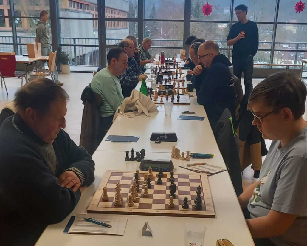 Danach kam etwas Hoffnung auf, denn Julius vermeldete auch einen ganzen Punkt. Er saß zwar direkt neben mir, aber wie er das gemacht hat, ist mit heute noch schleierhaft, die Stellung gegen Lothar war echt wild, da habe ich lieber nicht zu genau hingeschaut. Leider dämpfte Leo diese Hoffnung sofort wieder, sein Gegner hatte in der abschließenden Kombination offenbar genauer gerechnet.