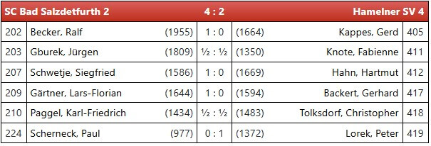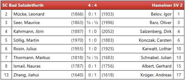 Damit lauetet der Endstand 4:4, nach dem Verlauf des Mannschaftskampfes ein für uns glückliches Ergebnis. Wahrscheinlich wird beiden Mannschaften der Punkt beim Klassenerhalt helfen, aber um den Aufstieg werden wir auch beide wohl nicht mitkämpfen.